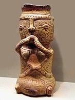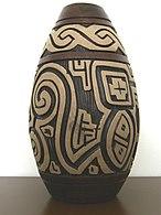 Marajoara culture flourished on Marajó island at the mouth of the Amazon River.[17] Archeologists have found sophisticated pottery in their excavations on the island. These pieces are large, and elaborately painted and incised with representations of plants and animals. These provided the first evidence that a complex society had existed on Marajó. Evidence of mound building further suggests that well-populated, complex and sophisticated settlements developed on this island, as only such settlements were believed capable of such extended projects as major earthworks.[18]