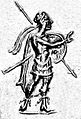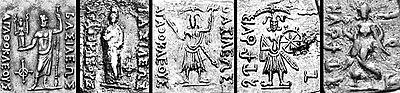 The Hinduist coinage of Agathocles is few but spectacular. Six Indian-standard silver drachmas were discovered at Ai-Khanoum in 1970, which depict Hindu deities.[98] These are early Avatars of Vishnu: Balarama-Sankarshana with attributes consisting of the Gada mace and the plow, and Vasudeva-Krishna with the Vishnu attributes of the Shankha (a pear-shaped case or conch) and the Sudarshana Chakra wheel.[98] These first attempts at incorporating Indian culture were only partly preserved by later kings: they all continued to struck bilingual coins, sometimes in addition to Attic coinage, but Greek deities remained prevalent. Indian animals however, such as the elephant, the bull or the lion, possibly with religious overtones, were used extensively in their Indian-standard square coinage. Buddhist wheels (Dharmachakras) still appear in the coinage of Menander I and Menander II.[99][100]