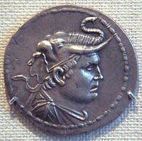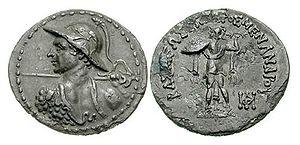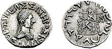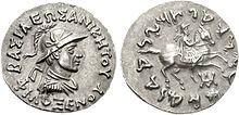 Demetrius I seems to have conquered the Kabul valley, Arachosia and perhaps Gandhara;[89] he struck no Indian coins, so either his conquests did not penetrate that far into India or he died before he could consolidate them. On his coins, Demetrius I always carries the elephant-helmet worn by Alexander, which seems to be a token of his Indian conquests.[90] Bopearachchi believes that Demetrius received the title of "King of India" following his victories south of the Hindu Kush.[91] He was also given, though perhaps only posthumously, the title Ἀνίκητος ("Aniketos", lit. Invincible) a cult title of Heracles, which Alexander had assumed; the later Indo-Greek kings Lysias, Philoxenus, and Artemidorus also took it.[92] Finally, Demetrius may have been the founder of a newly discovered Yavana era, starting in 186/5 BC.[93]