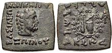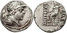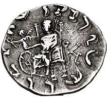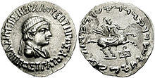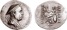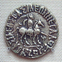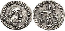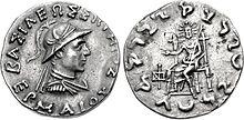 - ^ Tarn, p. 391: "Somewhere I have met with the zhole-hearted statement that every Greek in India ended by becoming a Buddhist (...) Heliodorus the ambassador was a Bhagavatta, a worshiper of Vshnu-Krishna as the supreme deity (...) Theodorus the meridrarch, who established some relics of the Buddha "for the purpose of the security of many people", was undoubtedly Buddhist". Images of the Zoroastrian divinity Mithra – depicted with a radiated phrygian cap – appear extensively on the Indo-Greek coinage of the Western kings. This Zeus-Mithra is also the one represented seated (with the gloriole around the head, and a small protrusion on the top of the head representing the cap) on many coins of Hermaeus, Antialcidas or Heliokles II.