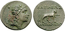 During the two centuries of their rule, the Indo-Greek kings combined the Greek and Indian languages and symbols, as seen on their coins, and blended Greek and Indian ideas, as seen in the archaeological remains.[12] The diffusion of Indo-Greek culture had consequences which are still felt today, particularly through the influence of Greco-Buddhist art.[13] The ethnicity of the Indo-Greek may also have been hybrid to some degree. Euthydemus I was, according to Polybius,[14] a Magnesian Greek. His son, Demetrius I, founder of the Indo-Greek kingdom, was therefore of Greek ethnicity at least by his father. A marriage treaty was arranged for the same Demetrius with a daughter of the Seleucid ruler Antiochus III. The ethnicity of later Indo-Greek rulers is sometimes less clear.[15] For example, Artemidoros (80 BC) may have been of Indo-Scythian ascendency, although this is now disputed.[16]
