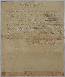 The Proclamation of Indonesian Independence (Indonesian: Proklamasi Kemerdekaan Indonesia, or simply Proklamasi) was read at 10:00 in the morning of Friday, 17 August 1945.[1] The declaration marked the start of the diplomatic and armed resistance of the Indonesian National Revolution, fighting against the forces of the Netherlands and pro-Dutch civilians, until the latter officially acknowledged Indonesia's independence in 1949.[2] The document was signed by Sukarno (who signed his name "Soekarno" using the Van Ophuijsen orthography) and Mohammad Hatta, who were appointed president and vice-president respectively the following day.[3][4]