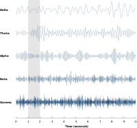 Neural oscillations have been most widely studied in neural activity generated by large groups of neurons. Large-scale activity can be measured by techniques such as EEG. In general, EEG signals have a broad spectral content similar to pink noise, but also reveal oscillatory activity in specific frequency bands. The first discovered and best-known frequency band is alpha activity (8–12 Hz)[8] that can be detected from the occipital lobe during relaxed wakefulness and which increases when the eyes are closed.[9] Other frequency bands are: delta (1–4 Hz), theta (4–8 Hz), beta (13–30 Hz), low gamma (30–70 Hz), and high gamma (70–150 Hz) frequency bands, where faster rhythms such as gamma activity have been linked to cognitive processing. Indeed, EEG signals change dramatically during sleep and show a transition from faster frequencies to increasingly slower frequencies such as alpha waves. In fact, different sleep stages are commonly characterized by their spectral content.[10] Consequently, neural oscillations have been linked to cognitive states, such as awareness and consciousness.[11][12]