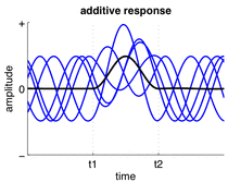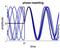 Phase resetting occurs when input to a neuron or neuronal ensemble resets the phase of ongoing oscillations.[51] It is very common in single neurons where spike timing is adjusted to neuronal input (a neuron may spike at a fixed delay in response to periodic input, which is referred to as phase locking[13]) and may also occur in neuronal ensembles when the phases of their neurons are adjusted simultaneously. Phase resetting is fundamental for the synchronization of different neurons or different brain regions[12][29] because the timing of spikes can become phase locked to the activity of other neurons.