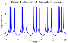 Scientists have identified some intrinsic neuronal properties that play an important role in generating membrane potential oscillations. In particular, voltage-gated ion channels are critical in the generation of action potentials. The dynamics of these ion channels have been captured in the well-established Hodgkin–Huxley model that describes how action potentials are initiated and propagated by means of a set of differential equations. Using bifurcation analysis, different oscillatory varieties of these neuronal models can be determined, allowing for the classification of types of neuronal responses. The oscillatory dynamics of neuronal spiking as identified in the Hodgkin–Huxley model closely agree with empirical findings. In addition to periodic spiking, subthreshold membrane potential oscillations, i.e. resonance behavior that does not result in action potentials, may also contribute to oscillatory activity by facilitating synchronous activity of neighboring neurons.[26][27] Like pacemaker neurons in central pattern generators, subtypes of cortical cells fire bursts of spikes (brief clusters of spikes) rhythmically at preferred frequencies. Bursting neurons have the potential to serve as pacemakers for synchronous network oscillations, and bursts of spikes may underlie or enhance neuronal resonance.[19]