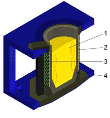 An induction furnace is an electrical furnace in which the heat is applied by induction heating of metal.[1][2][3] Induction furnace capacities range from less than one kilogram to one hundred tonnes, and are used to melt iron and steel, copper, aluminum, and precious metals.