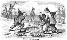 Contemporary writers from the Song dynasty note that, in Hubei and Fujian provinces, residents would only keep three sons and two daughters (among poor farmers, two sons, and one daughter), and kill all babies beyond that number at birth.[68] Initially the sex of the child was only one factor to consider. By the time of the Ming Dynasty, however (1368–1644), male infanticide was becoming increasingly uncommon. The prevalence of female infanticide remained high much longer. The magnitude of this practice is subject to some dispute; however, one commonly quoted estimate is that, by late Qing, between one fifth and one-quarter of all newborn girls, across the entire social spectrum, were victims of infanticide. If one includes excess mortality among female children under 10 (ascribed to gender-differential neglect), the share of victims rises to one third.[69][70][71]