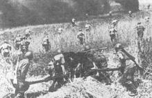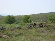 A Reihe could easily be formed into Schützenkette, or skirmish line. The machine gun deployed on the spot, while riflemen came up on the right, left or both sides. The result was a ragged line with men about five paces apart, taking cover whenever available. In areas where resistance was serious, the squad executed "fire and movement". This was used either with the entire squad, or the machine gun team down while riflemen advanced. Commanders were often cautioned not to fire the machine gun until forced to do so by enemy fire. The object of the firefight was to not necessarily to destroy the enemy, but Niederkämpfen - to beat down, silence, or neutralize them.