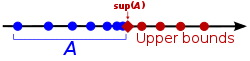 In analysis, infima and suprema of subsets of the real numbers are particularly important. For instance, the negative real numbers do not have a greatest element, and their supremum is 0 (which is not a negative real number).[1] The completeness of the real numbers implies (and is equivalent to) that any bounded nonempty subset of the real numbers has an infimum and a supremum. If is not bounded below, one often formally writes If is empty, one writes
