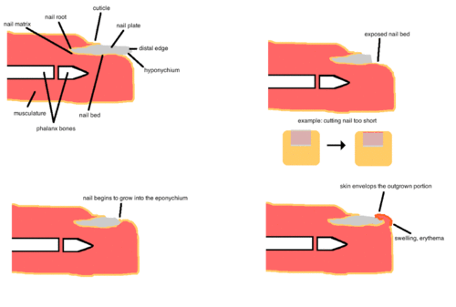 A common conception is that the nail enters into the paronychium, but an "ingrown toenail" can simply be overgrown toe skin.[2] The condition starts first from a microbial inflammation of the paronychium, and then a granuloma, which results in a nail buried inside of the granuloma. A true ingrown toenail is caused by actual penetration of flesh by a sliver of toenail.[3]