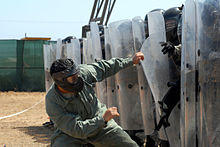 An initial reaction force (IRF), also known as an internal reaction force, or extreme reaction force (ERF) to inmates, is a type of small-scale riot squad in U.S. military prisons such as the Camp Delta detention center of Guantanamo Bay.[1][2][3] A squad is suited up and ready to respond, at all times, in instances when one or more detainees are combative or resistive.