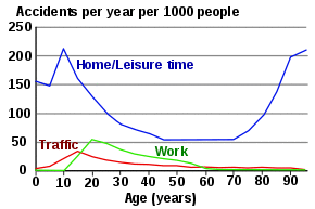 Due to anatomical and physiological differences, injuries in children need to be approached differently from those in adults.[92] Accidents are the leading cause of death in children between 1 and 14 years old.[75] In the United States, approximately sixteen million children go to an emergency department due to some form of injury every year,[75] with boys being more frequently injured than girls by a ratio of 2:1.[75] The world's five most common unintentional injuries in children as of 2008 are road crashes, drowning, burns, falls, and poisoning.[93]