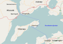 The Vangshylla–Kjerringvik Ferry connected the municipalities of Inderøy and Mosvik across the sound Skarnsund, at the narrowest point of the Trondheimsfjord. The route operated from 1 June 1964 to 19 December 1991, when it was replaced by the Skarnsund Bridge. It was part of Norwegian National Road 755. The ferry had hourly services in each direction through most of the day, and the crossing took seven minutes.[21]