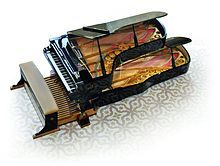 - ^ Actually in the picture only the row of 25 chromatic "fingers" which play the 25 black keys of the 5 octaves can be fully seen. Of the row of 36 diatonic "fingers" which play the 36 white keys of those 5 octaves and which is positioned underneath the row of chromatic "fingers" only the highest three "fingers" can be seen.