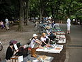 The park contains a small temple dedicated to Benzaiten. The park has a petting zoo and a small aquarium, and is a place where vendors, musicians, artists and street performers gather. The park is bustling with crowds who arrive to take in the lively environment on weekends and holidays, especially during the cherry blossom season when the entire park is overrun with visitors for hanami.