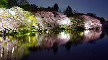 Spring in Inokashira Park is the season of the blooming cherry trees that line the pond. Looking from the Nanai Bridge, which crosses the pond near the center, the branches of the cherry trees extending from the shore bloom so densely as to all but cover the surface of the pond. The pale color of the blossoms contrasts with the sky and water's surface. During the blooming period of cherry blossoms the park receives many visitors. In addition, on the west side of the park there are many flowers to be seen in the flowering plum grove before the blooming period of the cherry trees. On the north side of the plum grove, on the edge of the pond, there is a spring, but its flow is nowadays weak.