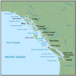 It is generally accepted that the southernmost point of the Inside Passage is Olympia, Washington, which is also the southernmost point of Puget Sound. Moving north, the passage continues into the waters of the greater Salish Sea. It then passes through the Strait of Georgia and Johnstone Strait, between northeastern Vancouver Island and the coast of mainland British Columbia. From there it continues further northwest into the Alaska Panhandle.[1][2] The northernmost points of the Passage are Haines and Skagway at the head of the Lynn Canal. As a result of often uncertain weather, large tidal range, fast or unpredictable currents, and infrequent safe anchorages, navigating the Inside Passage can be difficult.