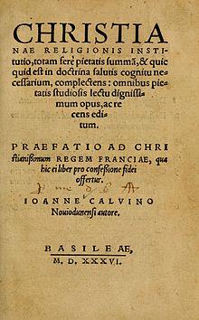 John Calvin was a student of law and then classics at the University of Paris. Around 1533 he became involved in religious controversies and converted to Protestantism, a new Christian reform movement which was persecuted by the Catholic Church in France, forcing him to go into hiding.[2] He moved to Basel, Switzerland, for safety in 1535, and around this time he must have begun writing a summary of theology which would become the Institutes.[3] His Catholic opponents sought to tie him and his associates (known as Huguenots in France) to groups of radical Anabaptists, some of which had been put down by persecution. He decided to adapt the work he had been writing to the purpose of defending Protestants suffering from persecution from false accusations that they were espousing radical and heretical doctrines. The work, written in Latin, was published in Basel in March 1536 with a preface addressed to King Francis I of France, entreating him to give the Protestants a hearing rather than continue to persecute them.[4] It is six chapters long, covering the basics of Christian creed using the familiar catechetical structure of the Ten Commandments, the Apostles' Creed, the Lord's Prayer, and the sacraments, as well as a chapter on Christian liberty and political theology. Soon after publishing it, Calvin began his ministry in Geneva, Switzerland.[5]