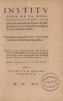 - Calvin, Jean (1541). Institution de la religion chrestienne: en laquelle est comprinse une somme de pieté, et quasi tout ce qui est necessaire a congnoistre en la doctrine de salut [Institution of the Christian Religion: in which is comprised a summary of piety, and almost all that is necessary to know in the doctrine of salvation] (in French). Genève: Michel Du Bois.