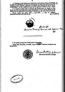 The Instrument of Accession is a legal document executed by Maharaja Hari Singh, ruler of the princely state of Jammu and Kashmir, on 26 October 1947.[1][2][a] By executing this document under the provisions of the Indian Independence Act 1947, Maharaja Hari Singh agreed to accede to the Dominion of India.[4][5]