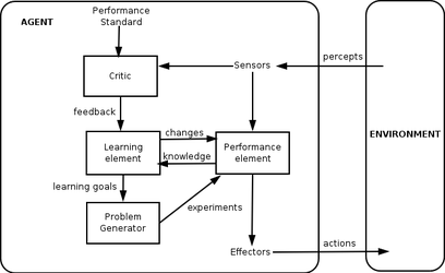 The learning element uses feedback from the "critic" on how the agent is doing and determines how the performance element, or "actor", should be modified to do better in the future. The performance element is what we have previously considered to be the entire agent: it takes in percepts and decides on actions.