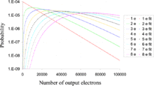 where P is the probability of getting n output electrons given m input electrons and a total mean multiplication register gain of g.