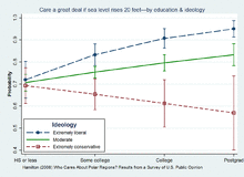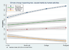 - Interaction between education and political orientation, affecting general-public perceptions about climate change. For example, US surveys often find that acceptance of the reality of anthropogenic climate change rises with education among moderate or liberal survey respondents, but declines with education among the most conservative.[16][17] Similar interactions have been observed to affect some non-climate science or environmental perceptions,[18] and to operate with science literacy or other knowledge indicators in place of education.[19][20]