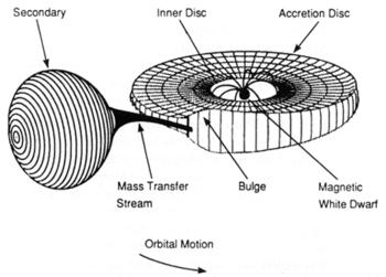 In intermediate polar systems, material stripped from a red dwarf secondary star flows into an accretion disk around the white dwarf, but the inner disk is truncated by the magnetic field of the white dwarf. In extreme instances, the disk can be fully disrupted, although this is uncommon.[2] In the region where the disk is truncated, the gas in the disk begins to travel along the white dwarf's magnetic field lines, forming curved sheets of luminous material called accretion curtains.[3] Disk material passes through the curtains and then accretes onto the white dwarf near one of its magnetic poles.