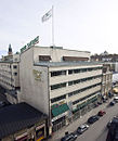 The exhibition Modern Architecture: International Exhibition ran from February 9 to March 23, 1932, at the Museum of Modern Art (MoMA), in the Heckscher Building at Fifth Avenue and 56th Street in New York.[18] Beyond a foyer and office, the exhibition was divided into six rooms: the "Modern Architects" section began in the entrance room, featuring a model of William Lescaze's Chrystie-Forsyth Street Housing Development in New York. From there visitors moved to the centrally placed Room A, featuring a model of a mid-rise housing development for Evanston, Illinois, by Chicago architect brothers Monroe Bengt Bowman and Irving Bowman,[19] as well as a model and photos of Walter Gropius's Bauhaus building in Dessau. In the largest exhibition space, Room C, were works by Le Corbusier, Ludwig Mies van der Rohe, J. J. P. Oud and Frank Lloyd Wright (including a project for a house on the Mesa in Denver, 1932). Room B was a section titled "Housing", presenting "the need for a new domestic environment" as it had been identified by historian and critic Lewis Mumford. In Room D were works by Raymond Hood (including "Apartment Tower in the Country" and the McGraw-Hill building) and Richard Neutra. In Room E was a section titled "The extent of modern architecture", added at the last minute,[20] which included the works of thirty seven modern architects from fifteen countries who were said to be influenced by the works of Europeans of the 1920s. Among these works was shown Alvar Aalto's Turun Sanomat newspaper offices building in Turku, Finland.