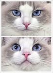 - Mitted – Same as pointed, but with white paws and abdomen. With or without a blaze (a white line or spot on the face), but must have a "belly stripe" (white stripe that runs from the chin to the genitals) and a white chin. Mitted Ragdolls, which weren't allowed titling in CFA until the 2008–2009 show season, are often confused with Birmans. The easiest way to tell the difference is by size (the Ragdoll being obviously larger) and chin color (Mitted Ragdolls have white chins,[19] while Birmans have colored chins), although breeders recognize the two by head shape and boning.