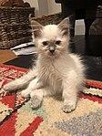 In the 1960s, a regular, non-pedigreed, white domestic longhaired cat named Josephine produced several litters of typical cats. She was pregnant and got hit by a car which probably damaged her brain and was passed on to the kittens. It originated in Riverside, California with a woman named Ann Baker.[3] Josephine was of a Persian/Angora type and had litters sired by several unknown male Birman or Burmese-like cats, one of which had the Siamese point coloration. Josephine later produced kittens with a docile, placid temperament, affectionate nature, and a tendency to go limp and relaxed when picked up.[4]