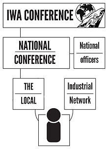 The sample flowchart on the right shows the relationship of the individual to the organization within Britain and Ireland IWA affiliate the Solidarity Federation. If an individual wishes to change the organization's policies, they must win agreement from their Local to formally place the idea before Federal Conference, which in turn, if other Locals agree, may place the idea before the IWA as a whole for a decision. While federal officers are mandated by the Federal Conference, they have no influence over policymaking other than through their own Locals.