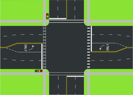 At intersections with large proportions of turning traffic, turn lanes (also known as turn bays)[3] may be provided. For example, in the intersection shown in the diagram, left turn lanes are present in the right-left street.