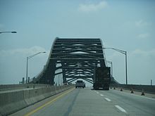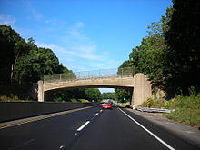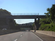 Many bridge designs were used for roads over the highway, including the concrete arch bridge, the through plate girder bridge, and the concrete T-beam bridge.[118][119][120] Bridges used to carry the turnpike over other roads and streams included a concrete arch viaduct in New Stanton.[121] At 600 feet (180 m), the New Stanton viaduct was the longest bridge along the original section of the turnpike.[122] Other turnpike bridges included plate girder bridges like the bridge over Dunnings Creek in the Bedford Narrows. Smaller concrete T-beam bridges were also built[123][124] A total of 307 bridges were constructed along the original section of the turnpike.[122]