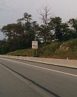 Eleven interchanges were built along the turnpike, most of which were trumpet interchanges in which all ramps merge at the toll booths;[125][126] only the New Stanton, Carlisle, and Middlesex interchanges did not follow this design.[125] Lighting was installed approaching interchanges, along with acceleration and deceleration lanes.[116] The road also featured guardrails, consisting of steel panels attached to I-beams.[127] Large exit signs were used, and road signs had cat's-eye reflectors to increase visibility at night.[127][128] Billboards were prohibited.[129] In September 1940, the Pennsylvania Public Utility Commission ruled that trucks and buses would be allowed to use the highway.[130]