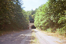 Before the first-section groundbreaking, in 1937 the turnpike commission sent workers to assess the former railroad tunnels. In September of that year, a contract was awarded to drain water from the tunnels.[136] After this, workers cleared rock slides and vegetation from the tunnel portals before evaluating the nine tunnels' condition.[137][138] It was decided that six of the nine former South Pennsylvania Railroad tunnels could be used for the roadway. The Allegheny Mountain Tunnel was in too poor a condition for use, and the Quemahoning and Negro Mountain tunnels would be bypassed with rock cuts through the mountains.[138] The Quemahoning Tunnel had been completed and used by the Pittsburgh, Westmoreland and Somerset Railroad.[139]