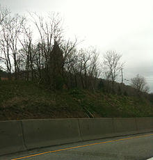 The first work to begin on the road was grading its right-of-way, which involved a great deal of earthwork due to the mountainous terrain.[140] Building the highway required the acquisition of homes, farms, and a coal mine by eminent domain.[101] A tunnel was originally planned across Clear Ridge near Everett, but the turnpike commission decided to build a cut into the ridge.[19] Building the cut involved bulldozers excavating the mountain and explosives blasting the rock.[141] Concrete culverts were built to carry streams and roads under the highway in the valley floor.[142] The Clear Ridge cut was 153 feet (47 m) deep (the deepest highway cut at the time), and was known as "Little Panama" after the Panama Canal.[122] West of Clear Ridge, cuts and fills were built for the turnpike to pass along the southern edge of Earlston.[143]