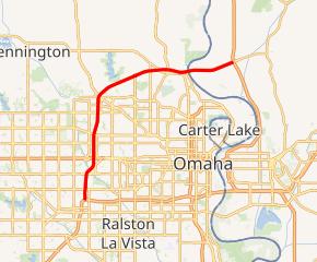 Interstate 680 begins at a complex interchange with I-80 in Omaha. Due to the proximity of the West Center Road interchange on I-680 and the I, L and Q Street interchanges on I-80, all of the exit and entrance ramps which connect I-80 to I-680 also connect to West Center Road and I, L and Q Streets. The freeway heads north through the heart of West Omaha; it serves as a dividing line of several residential neighborhoods.[5][6] Two miles (3.2 km) north of West Center Road, which prior to 2003 was N-38,[7] is a new interchange with U.S. Route 6 (US 6), known as Dodge Street in Omaha.[1] Another mile north of Dodge Street is N-64, known as Maple Street.[1]