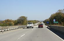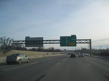 In Pennsylvania, I-90 is called the "AMVETS Memorial Highway".[15] This non-tolled section of I-90 extends from the Ohio state line through to New York state passing south of Erie, Pennsylvania. It is also signed as such in New York. Although this was supposed to be the "Erie Extension" of the Pennsylvania Turnpike, it was actually completed in 1958 with funding from the Pennsylvania Turnpike Commission. When this portion of the highway was open, the speed limit was 50 mph (80 km/h).[16] At 46.4 miles (74.7 km), it is I-90's shortest single-state length.