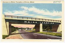 The Maine Turnpike Authority was created by the Maine Legislature in 1941 to build and operate a toll highway connecting Kittery and Fort Kent. In 1947, the first section of highway, designated the Maine Turnpike, opened between Kittery and Portland. In 1953, the Turnpike Authority began construction on an extension to the state capital at Augusta using the former right-of-way of the Portland–Lewiston Interurban railway from Portland through West Falmouth.[5] The original turnpike was the largest construction project in the state's history until the construction of the extension, which opened to the public on December 13, 1955.[6]