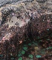 Marine biologists divide the intertidal region into three zones (low, middle, and high), based on the overall average exposure of the zone.[1] The low intertidal zone, which borders on the shallow subtidal zone, is only exposed to air at the lowest of low tides and is primarily marine in character. The mid intertidal zone is regularly exposed and submerged by average tides. The high intertidal zone is only covered by the highest of the high tides, and spends much of its time as terrestrial habitat. The high intertidal zone borders on the splash zone (the region above the highest still-tide level, but which receives wave splash). On shores exposed to heavy wave action, the intertidal zone will be influenced by waves, as the spray from breaking waves will extend the intertidal zone.