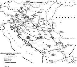 Professor Jozo Tomasevich and others divide the invasion and resultant fighting into two phases.[78] The first phase encompasses the Luftwaffe's devastating air assault on Belgrade and airfields of the Royal Yugoslav Air Force of 6 April, and an initial thrust of the German XL Panzer Corps from Bulgaria towards Skopje that commenced the same day.[79] This was followed by the assault of the German XIV Panzer Corps from Bulgaria towards Niš on 8 April.[80] On 10 April, four more thrusts struck the Yugoslav Army; the XLI Panzer Corps from Romania towards Belgrade, the XLVI Panzer Corps from Hungary across the Drava,[81] the LI Infantry Corps from Austria towards Zagreb,[82] and the XLIX Mountain Corps from Austria towards Celje.[83] By the end of that day, the Yugoslav Army was disintegrating, and was in retreat or surrendering right across the country, with the exception of the forces on the Albanian frontier.[78] Italy and Hungary joined the ground offensive on 11 April. The Italian part in the ground offensive began when their 2nd Army attacked from northeastern Italy towards Ljubljana and down the Dalmatian coast, meeting virtually no resistance. On the same day, the Hungarian 3rd Army crossed the Yugoslav border and advanced toward Novi Sad, but like the Italians, they met no serious resistance. On 12 April, German troops captured Belgrade,[84] and Ljubljana fell to the Italians.[85] On 14 and 15 April, King Peter and the government flew out of the country,[86] and the Yugoslav Supreme Command was captured by the Germans near Sarajevo.[87] The surrender was signed on 17 April, and came into effect at noon on 18 April.[88]