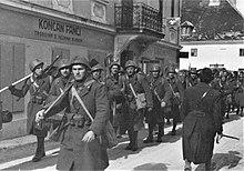 In the opening days of the invasion, Italian forces on the Slovene border carried out minor actions in the Sava valley and in the Kastav area, capturing some Yugoslav positions on Mount Peč on 7 April, Kranjska Gora, Zavratec and Godz on 8 April, Kastav, the source of the Rječina river, Kalce and Logatec on 9 April, and repelling on 8 April a Yugoslav attack in the Cerkno Hills.[107] On 11 April, the 2nd Army launched its offensive, capturing Ljubljana, Sušak and Kraljevica on the same day.[108] On 12 April the 133rd Armoured Division Littorio and the 52nd Infantry Division Torino took Senj, on 13 April they occupied Otočac and Gradac, while Italian naval forces occupied several Dalmatian islands.[108] A scheduled Yugoslav attack against the Italian enclave of Zara did not materialize, and the city garrison's troops started to advance until they met the "Torino" Division near Knin, which was taken on the same day.[108] Split and Šibenik were taken on 15 and 16 April, respectively, and on 17 April the Motorized Corps took Dubrovnik, after covering 750 kilometers in six days.[109]
