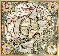- "It is said in the book concerning the fortunate discovery [Inventio Fortunate] that at the arctic pole there is a high magnetic rock, thirty-three German miles in circumference. A surging sea surrounds this rock, as if the water were discharged downward from a vase through an opening. Around it are islands, two of which are inhabited."