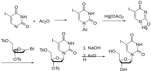 It is a nucleoside analogue, a modified form of deoxyuridine, similar enough to be incorporated into viral DNA replication, but the iodine atom added to the uracil component blocks base pairing. It is used only topically due to cardiotoxicity. It was synthesized by William Prusoff in the late 1950s.[1] Initially developed as an anticancer drug, idoxuridine became the first antiviral agent in 1962.[2]