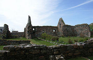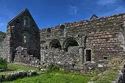 The Iona Nunnery was an Augustinian convent located on the island of Iona in the Inner Hebrides of Scotland. It was established sometime after the foundation of the nearby Benedictine monastery in 1203. Bethóc, daughter of Somerled, was first prioress. The ruins of the nunnery stand in a peaceful garden adjacent to Iona's main (and only) village, Baile Mor. They form the most complete remains of a medieval nunnery extant in Scotland. After the Reformation, the priory was dissolved and reduced to a ruin.