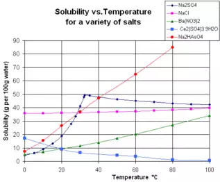 If the ionic compound is soluble in a solvent, it can be obtained as a solid compound by evaporating the solvent from this electrolyte solution.[10] As the solvent is evaporated, the ions do not go into the vapor, but stay in the remaining solution, and when they become sufficiently concentrated, nucleation occurs, and they crystallize into an ionic compound. This process occurs widely in nature and is the means of formation of the evaporite minerals.[11] Another method of recovering the compound from solution involves saturating a solution at high temperature and then reducing the solubility by reducing the temperature until the solution is supersaturated and the solid compound nucleates.[10]