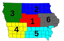 | 6 | Cedar Rapids | Benton, Buchanan, Cedar, Clinton, Delaware, Dubuque, Iowa, Jackson, Johnson, Jones, Linn, and Scott[17] |