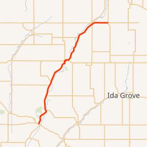 At Correctionville, Iowa 31 intersects U.S. Highway 20 and then curves around following the eastern bank of the Little Sioux. The route continues north-northeast, clipping the northwestern corner of Ida County, before entering Cherokee County south of Washta. At Quimby, the route turns east and travels 4 miles (6.4 km) to its northern end at U.S. Highway 59.[1]