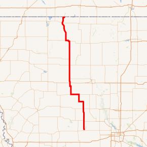 Iowa Highway 4 (Iowa 4) is a state highway which runs from north to south across the state of Iowa. It is 146 miles (235 km) long, beginning at an intersection with Iowa Highway 44 in Panora and ending at the Minnesota state line north of Estherville. It continues north as Minnesota State Highway 4. The route was created on January 1, 1969, when several route designations were changed to match other states' route numbers. Before 1969, Iowa 4 was known as Iowa 17.